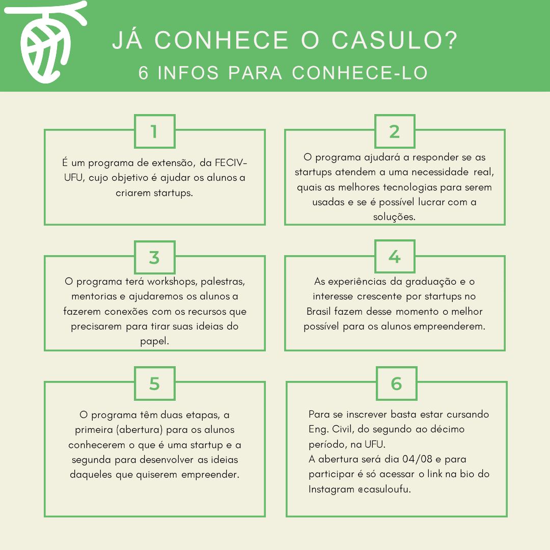 O Casulo é um programa de extensão que nasceu para ajudar os alunos a empreenderem por meio de startups e foi desenhado especialmente para a realidade da FECIV/UFU.